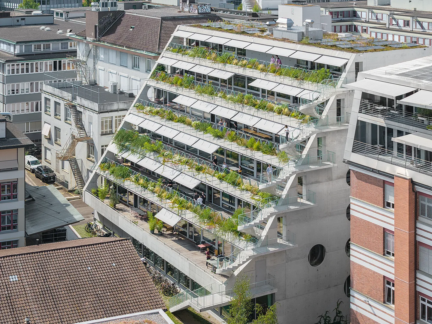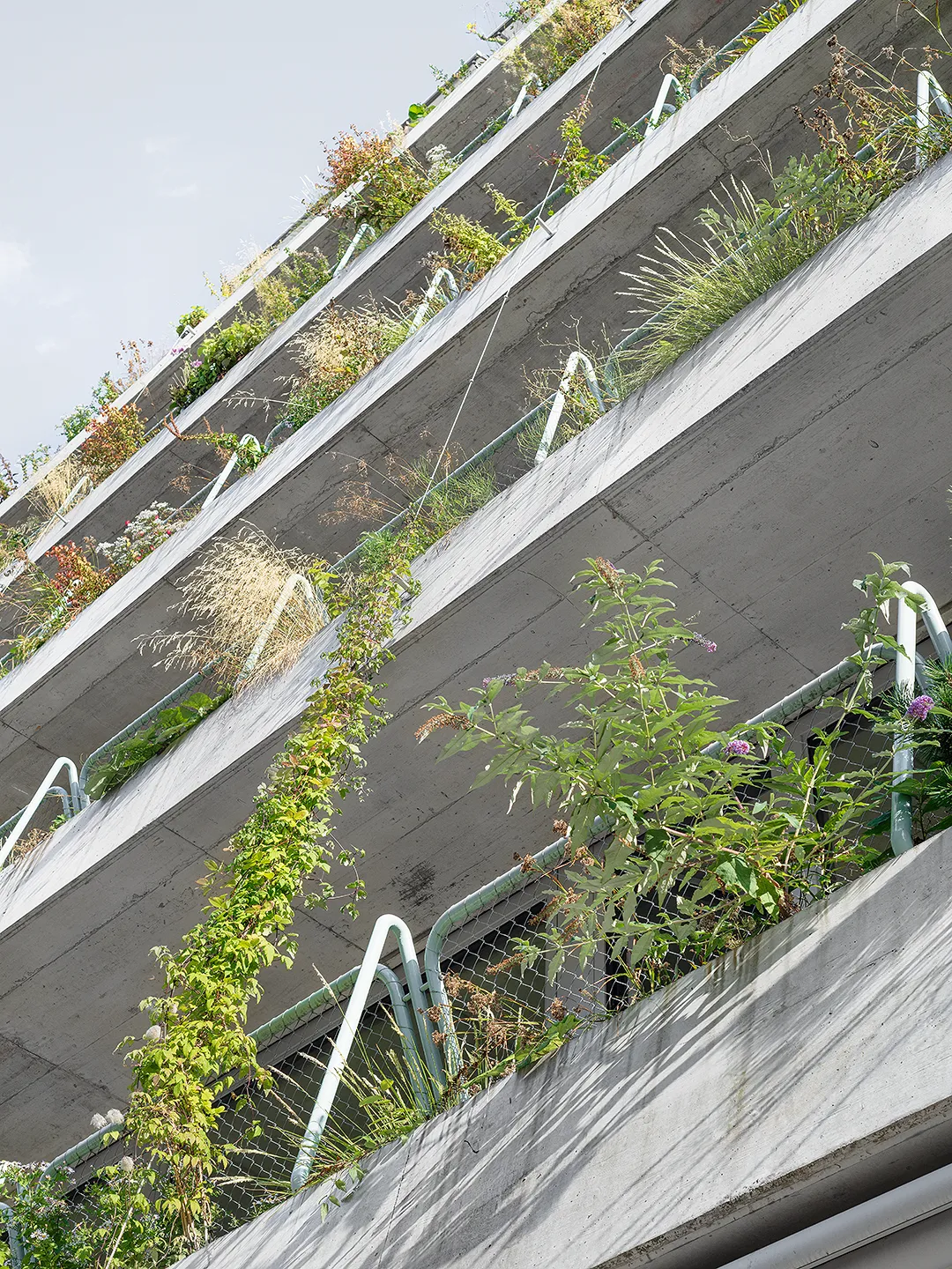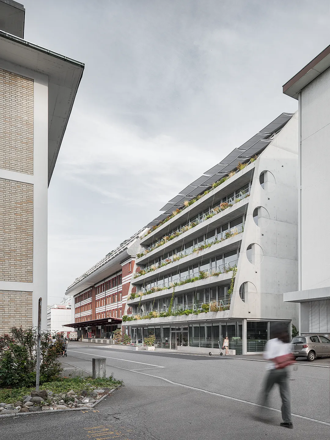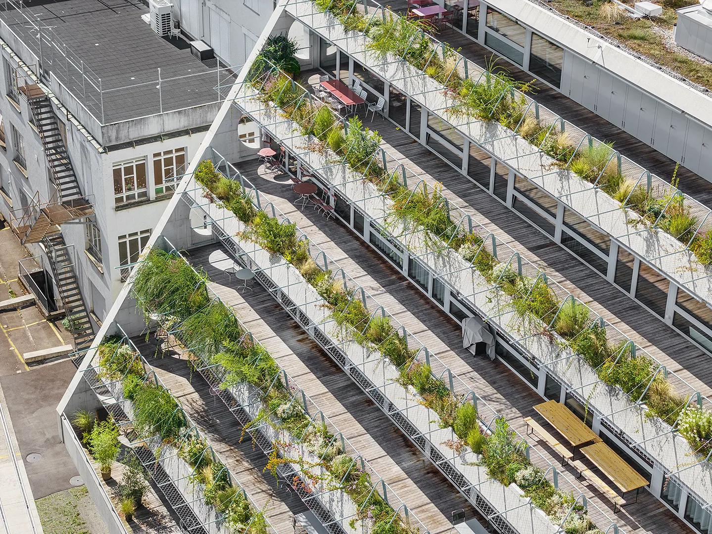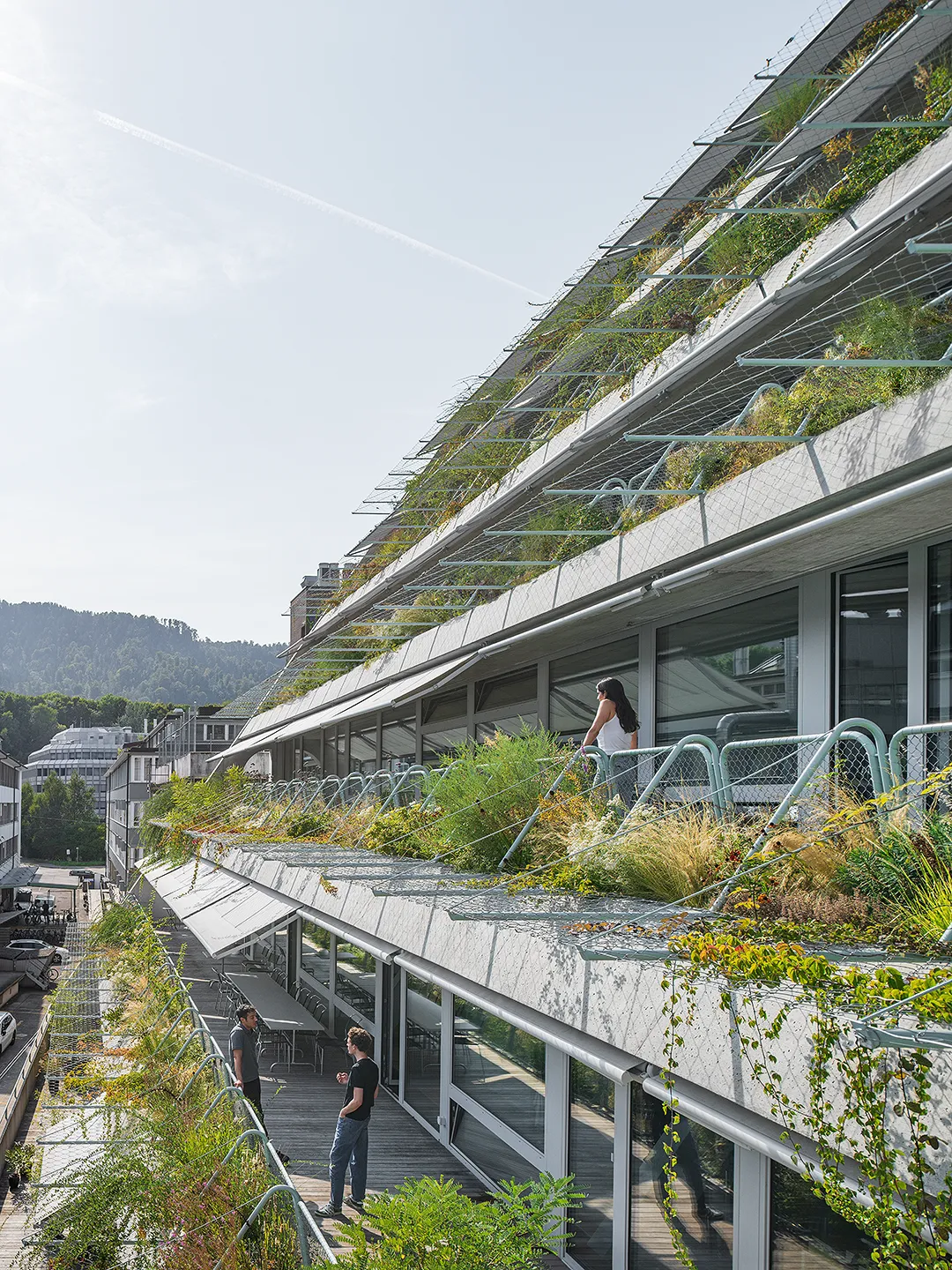 Building portrayed for EM2N with a focus on plants, vegetation and terraced greenery. The vibrant green oasis in the industrial district of Binz, provides climatic benefits by protecting from the sun and cooling down the air around.