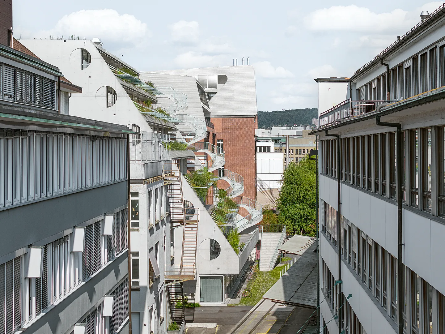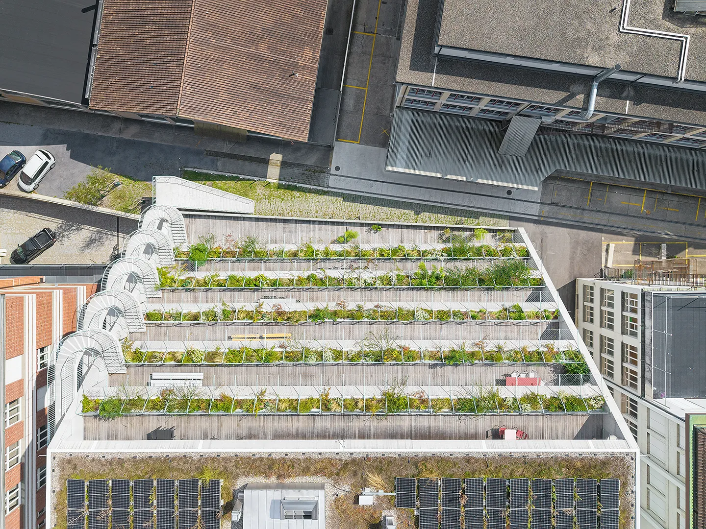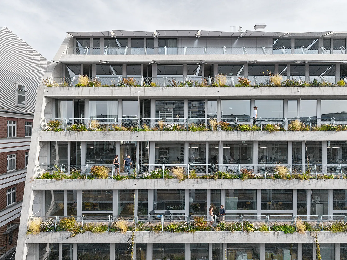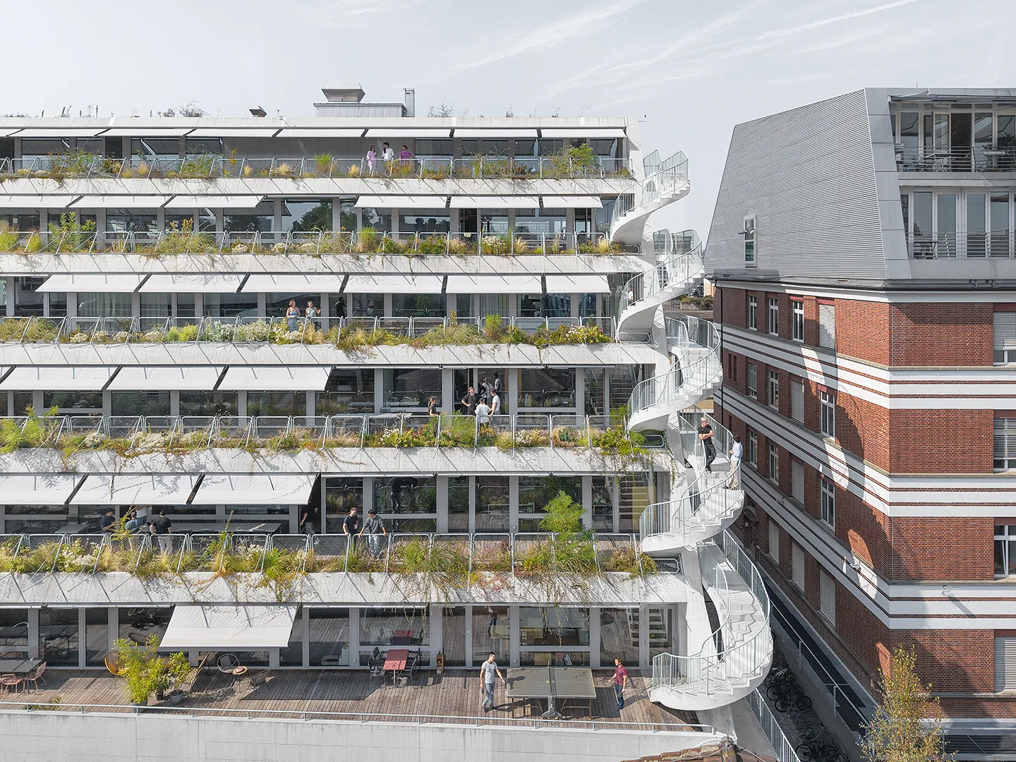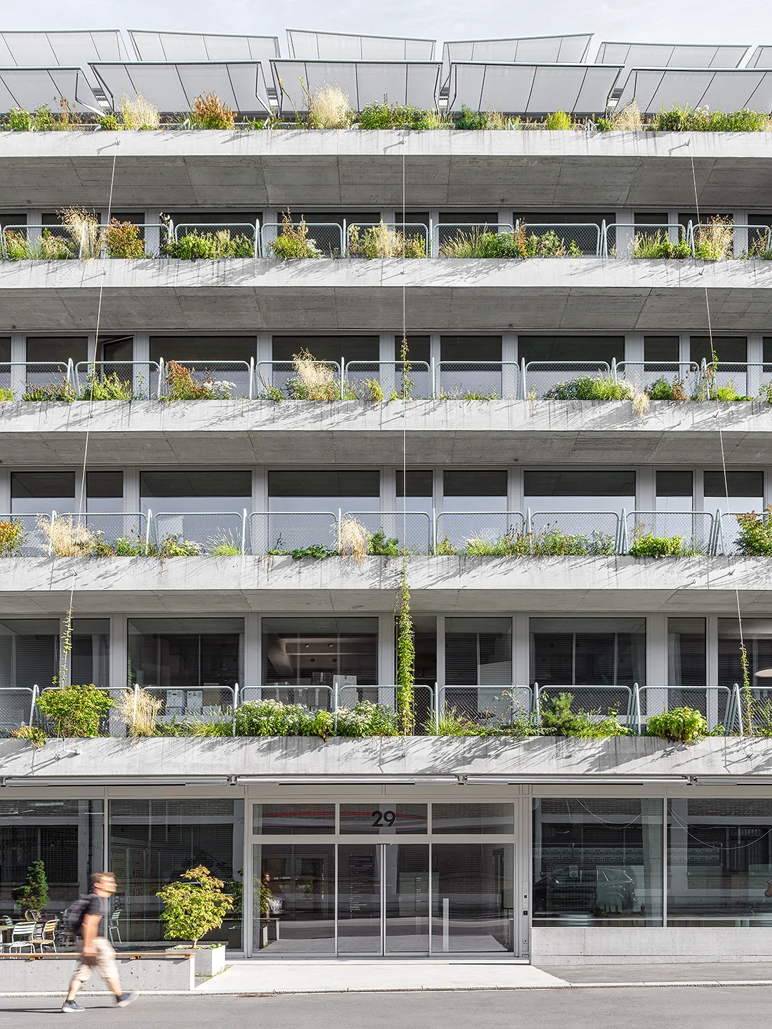 Building portrayed for EM2N with a focus on plants, vegetation and terraced greenery. The vibrant green oasis in the industrial district of Binz, provides climatic benefits by protecting from the sun and cooling down the air around.